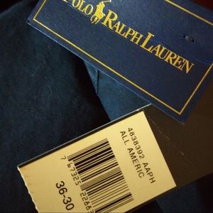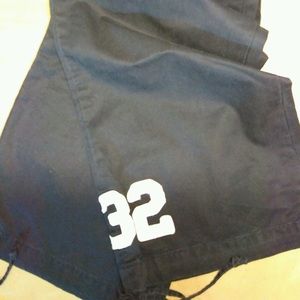 These all American twill pants are beautifully constructed with the classic American shield patch under the front pocket and the number 32 at the bottom of one of the pant legs. There are drawstrings at the bottom of both pant legs and also on the waistline.