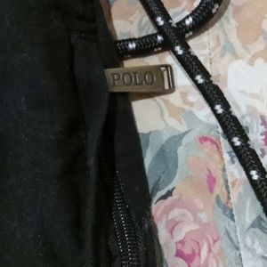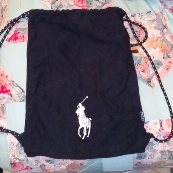 unisex black drawstring bag with white embroidered polo design on front. has double drawstring straps to wear as a backpack along with a zipper pocket on the side for easy access to small things such as your cellphone, money, wallet, or lipstick. barely used no flaws.