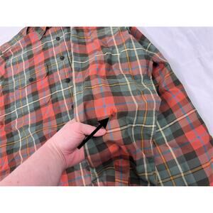 POLO by Ralph Lauren mens plaid casual 2 pocket button down shirt size Large L. Pit to Pit measurements are 23 inches and a length of 32 inches (Please check photos for all measurements). This plaid button up shirt is in good used condition with some distressing on the back of the left elbow shown in photo 4. This shirt is perfect for going hiking, being outdoors, doing work, or working outdoors. It has a nice neutral color look with shades of pastel green red blue checkered plaid pattern. 100% cotton.