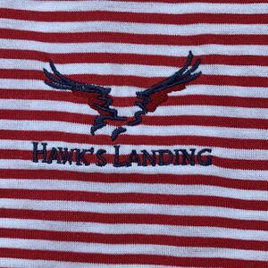 Polo Golf Ralph Lauren white/red stripe. Short Sleeve.Embroidered HAWK’S LANDING logo and also logo on the left sleeve. Size XXL. 100% cotton.