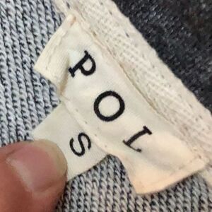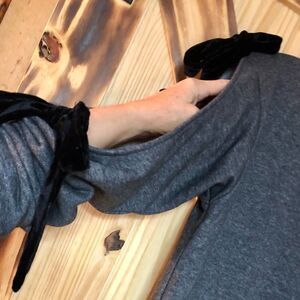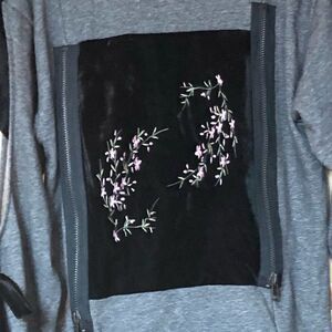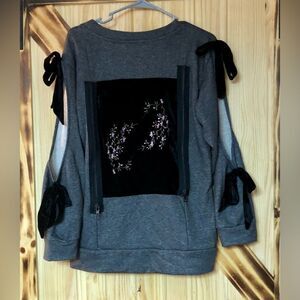 Unique POL round neck top, long open sleeves have black velour tie detail at the shoulders and mid arm. Heavy duty asymmetrical zipper accents frame a floral embroidered velour patch on the back of the garment