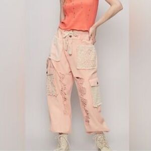 POL Pink Haze Distressed Crochet Denim Jogger Pants NWOT