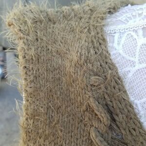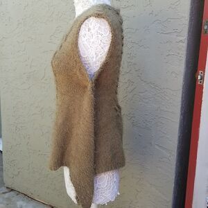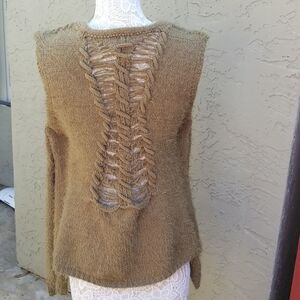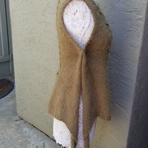 This is so soft. It's like a poncho/cape. It feels and looks like angora or alpaca, but it's a poly/nylon blend so it doesn't need to be dry cleaned. It's a size small, but would easily fit a size large. The PTP measurement is 20". Pretty olive green, with fun knit detail in front and back. Would be cute with a bando or a cute bralette underneath! Has a shark bite hem, and is mostly open on the sides. B27.7