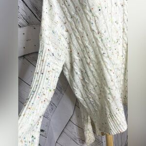 Cream v-neck relaxed fit sweater with a high/low hemline. Rainbow speckles all over.