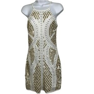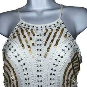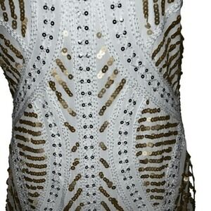 POLY USA BY NEBLON White Chiffon Sheath Dress Sequin Adorned Cut Out Back EUC S