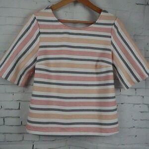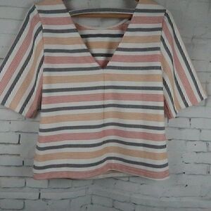 WHITE WITH BLACK & ORANGE STRIPES 1/2 SLEEVE ROUND NECK V BACK WITH STRAP CROPPED TOP BY POMAGE CLOTHING SIZE XS PRE OWNED LIKE NEW CONDITION