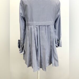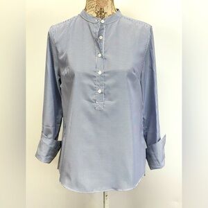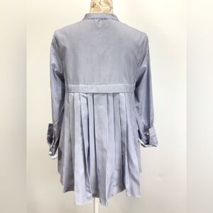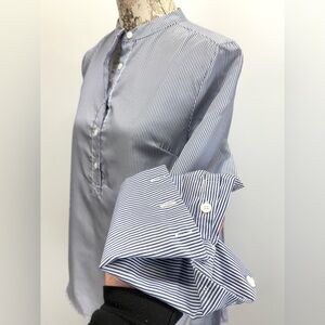 This elegant top from Pomander Place, size S, features cuffed long sleeves and pleated accordion back, offering a sophisticated yet relaxed style. Crafted in a blue and white micro stripe, it is perfect for both business casual and everyday wear.
