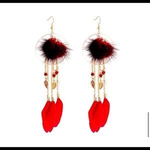 Pom Pom Drop Earrings Features long chain and feathers Color red Gorgeous earrings