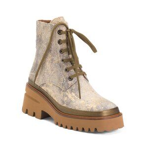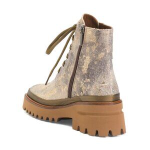 lace up front, leather lining, lug sole, metallic trim, distressed metallic finish, size chart conversion may vary slightly by country