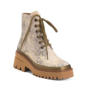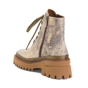 Brand New Color: Copper lace up front, leather lining, lug sole, metallic trim, distressed metallic finish, size chart conversion may vary slightly by country 2.5in. heel ankle boots 5.5in. shaft height, 8in. shaft circumference, taken from size 37 square toe, side zip closure leather upper, man made sole imported, made in Spain