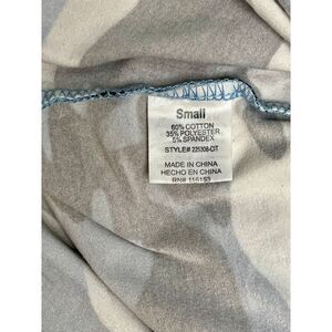 POOF NY Blue Camouflage Stretch Super Soft Crew Neck Top SMALL Curved Shirttail. Jersey Knit Cotton. 60% Cotton 35% Polyester 5% Spandex. Machine washable. Tumble dry. In excellent condition. No rips, tears, holes, stains, discoloration, etc. Feminine. Contemporary. Modern. Cozy. Summer. T-shirt.