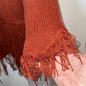 Cozy up in this stylish rust sweater featuring fringe details. Perfect for layering and adding a pop of color to your outfit. Absolutely beautiful