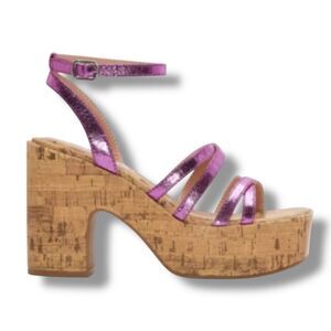 These platform sandals are a unique warm-weather style showstopper. Featuring metallic pink straps and a cork heeled base, this open square-toe style has an ankle strap closure. Wear them with a dress or skinny-leg jeans and a blouse.