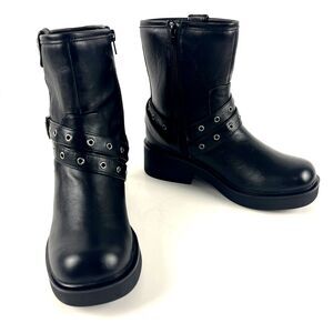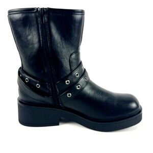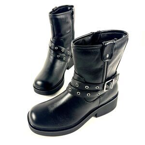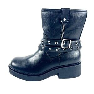 POP Billboard Motorcycle Biker Boots Womens SZ 8M Black Faux Leather Buckle Crisscross eyelet strap overlay Side Zip Closure Round Toe Block Heel Platform Chunky MSRP $80