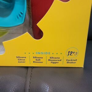 Includes silicon salt rimmer, silicone citrus juicer, silicone measured jigger, 12 oz silicone cocktail shaker.