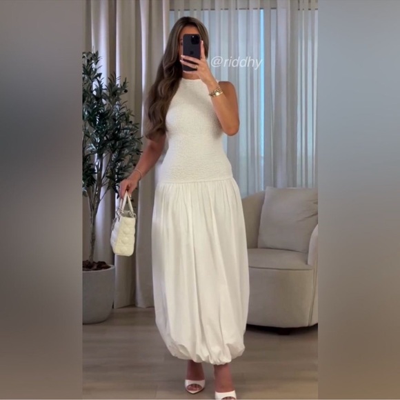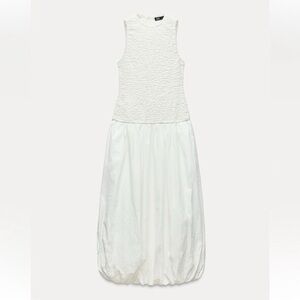 Sleeveless long dress with round neckline. Textured stretch fabric. Tonal matching poplin balloon style bottom section. Back opening with button closure.