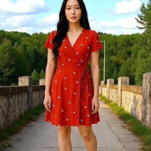 POPSUGAR SZ XS Red Floral Print Short-sleeve Wrap Dress