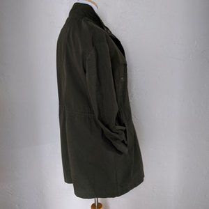 POPSUGAR dropped shoulder utility jacket in always versatile olive/army green color. Lightweight 100% cotton chambray construction, dropped shoulder design, adjustable drawstring waistband make this jacket the perfect everyday essential. Zip and snap closure, button cuff sleeves, side pockets, decorative breast pocket flaps