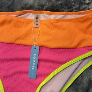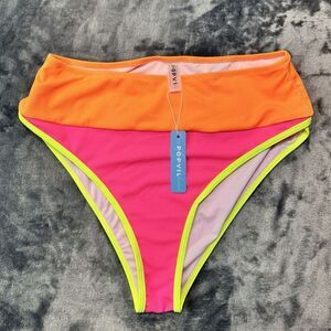 POPVIL Sz L High Waisted Bikini Bottom Neon Color Block Pink Yellow Orange NWT