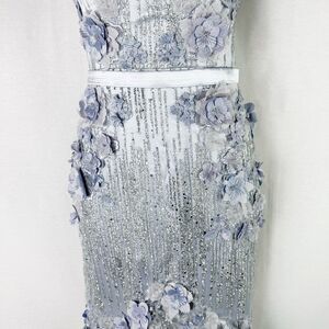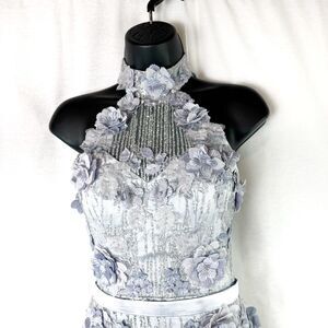 •Additional Details: Zip closure in center back. Halter neckline. Sleeveless. Covered in silver glitter, flowers and beading. Actual dress is more white than it appears in photo 2.