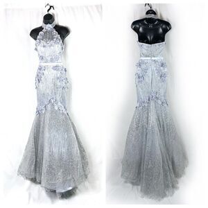 PORTIA AND SCARLETT Ice Queen Blue Silver Glitter Flower Halter Mermaid Gown 0