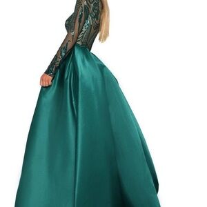 Portia and Scarlett PS1705 is a patterned sequin gown, paired with a stylish detachable overskirt. It is a high front, high back, long sleeve gown, which comes with an overskirt. The overskirt is in a thick, plain satin fabric. The dress is fully lined. Pageant, Prom, special occasion.