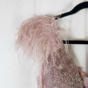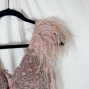 PORTIA AND SCARLETT Pink Silver Glitter Plunge Gown Train Feathers Size 6 PS6072