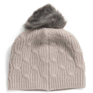 PORTOLANO Wool Blend Cable Knit Beanie With Faux Fur Pom NWT