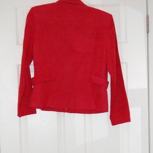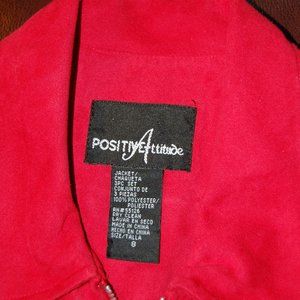 POSITIVE ATTITUDE Red Zipper Jacket Size 8. Shoulder Pads Soft Velour Type Fabric.19" Arm Pit to Arm Pit, 24" Collar to Hem, 22" Shoulder to cuff Good Preowned COndition