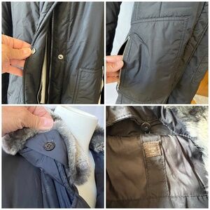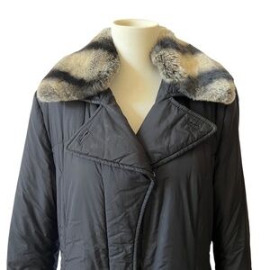 Womens size 12, long winter parka, removable fur collar, hidden zipper and snap front, zip pockets, knee length, warm, cozy, ski resort, snow, winter.