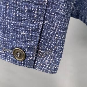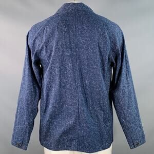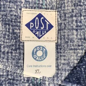 POST O'ALLS shirt jacket in a navy and grey cotton woven fabric featuring a marbled pattern, four patch pockets, and button closure. Made in USA.Very Good Pre-Owned Condition. Multiple moderate marks; however they are all well covered by the pattern.Marked: XLMeasurements:Shoulder: 16 in.Chest: 46 in.Sleeve: 27 in.Length: 28 in.