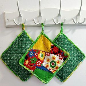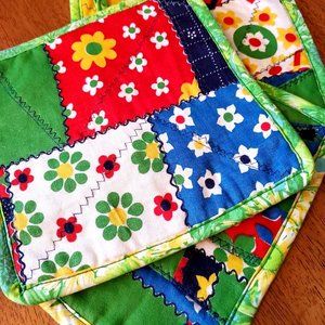 This set is in patchwork theme print and matching fabric on the back. The size of the potholders are about 7".