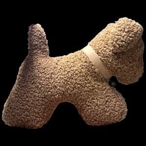 The Pottery Barn cozy teddy dog "Labradoodle" with bell collor pillow is a charming addition to any home decor, featuring a realistic dog shape made of cozy sherpa fabric.