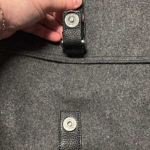 Elevate your daily style with a wool felt bag. The rich charcoal color is accented with black leather trim and nickel hardware. The straps convert it from a messenger bag to a backpack, and the compact size accommodates a laptop.