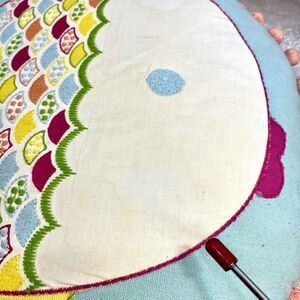 The Pottery Barn Kids Decorative Throw Fish Pillow is a vibrant addition to any child's bedroom. Featuring a playful fish print on a colorful background, this round pillow with pom pom detailing adds a fun and whimsical touch to the room. Measuring 17 inches in diameter, it is the perfect size for kids to snuggle up with. The sea life theme and fish character family make it a perfect choice for young ocean lovers.