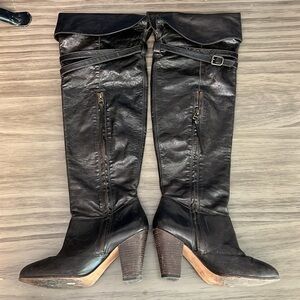 Gorgeous buttery soft leather inside and out Pour La Victoire brown leather over the knee boots size 8. Good used condition with normal signs of scuffing to leather, heels and bottom of shoes. Top flap can be folded over, inside zipper & wrap around buckle detail. Measurements in pics. Please comment below with any questions