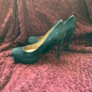 These suede platform pumps feature seam details at the toe and heel cap. 1.25" hidden platform and 4.75" covered stiletto heel. Leather sole.