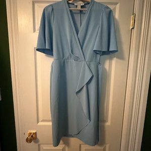 In perfect condition! This wrap dress is flattering on anyone. The soft sleeves and detail on the trim class up what would otherwise be a simple dress! The crepe fabric is so flattering and never needs an ironing. Recently dry cleaned and looking for a new home! Only selling because I don't find myself wearing it enough.
