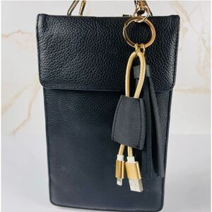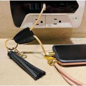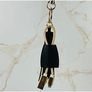 Power up in style. Don't get caught out there without the right cable. This is a stylish and small way to take your power on the go. It's a cute and handy smart phone keychain with USB/iPhone charger cable with tassel. This clips on your bag or tucks into your makeup case. Made if black faux leather and gold-tone hardware, it has a dogleash-type clasp, Infiniti key ring, and black faux leather sleeve that slides down to keep your connectors clean. This was mine and I LOVED IT – then I got a new phone. It has a USB-A connector on one and an iPhone connector on the other. It features an iPhone lightning input (compatible up to iPhone 14), as well as a USB–C. Simply plug the input into your phone and the USB into your power source(power bank) to charge your phone while in your bag. It's in perfect condition since I kept it in a case and it's like new!