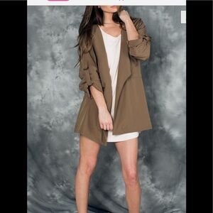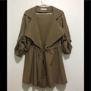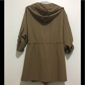 In excellent condition, size M, This jacket has adjustable sleeves that allow it to be worn as long sleeve or ¾ sleeve. Lightweight, Also, the jacket has a hood to protect you from any weather conditions. Can be worn with your favorite dress and booties for a trendy look that’s perfect for a night out. 100% polyester, no trades