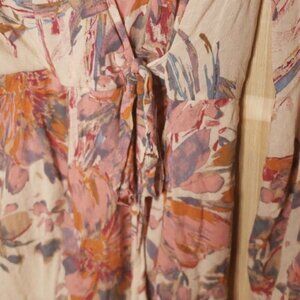 PPLA women’s floral bell sleeve shorts romper XS. Gently used condition. Measurements are: 23 ½" sleeve, 30" from shoulder to hem, 17 ½" from armpit to armpit, 13 ½" from waist to hem, 3 ½" rise, and 30" waist.