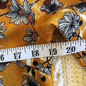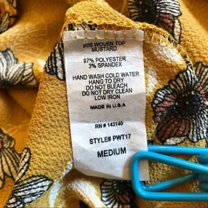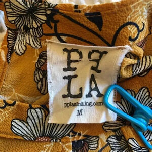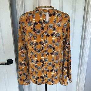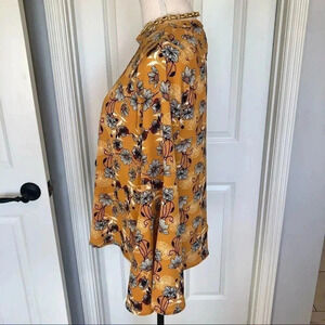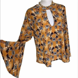 PPLA mustard yellow boho style floral blouse with keyhole front and flair bell sleeves size medium. In excellent used condition