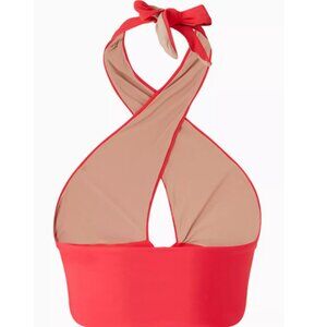 Luxurious stretch nylon fabric, cut to a sleek triangle shape featuring a crossed halter neckline with the classic front self-tie bow and keyhole front tied at the nape of the neck.