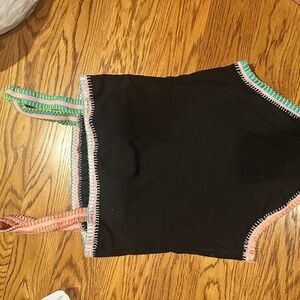 PQ's one-piece swimsuit is tailored squareneck and full coverage fit. Decorated with bright crochet trim, this style features fixed shoulder straps. Note the color of the crochet in the actual item varies slightly.