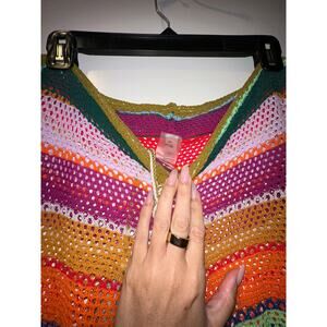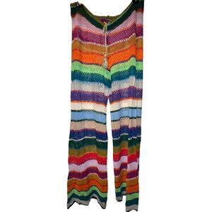 Vibrant crochet pants with multicolor stripes. Perfect for a bold look. Drawstring waist with rope tie design
