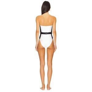 From the Hayleebaylee x PQ Collection.This one-piece swimsuit is elevated by a strapless neck and cinched belted waist. Bold contrast trim lends a colorblocked design to the look.