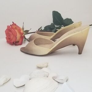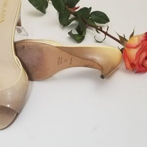 PRADA -2 Tone Beige glossed Leather Kitten Heels Sandals, slip on, made in Italy. it has some scuffs and a little peeling on the heel as seen in the picture.