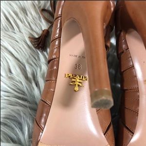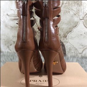 Authentic Prada strapy laceup bootie. Camel color lamb leather, Leather Zip pull, heel height 4.5’ inches. -platform heel height .5’ inches - comes with box & dust bag, new bottom sole. gently worn. Please Know your size. Excellent Quality Product.🥇bundle and save