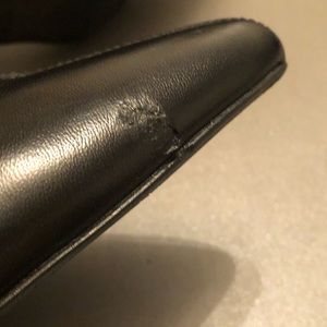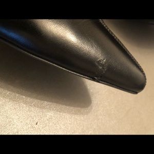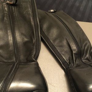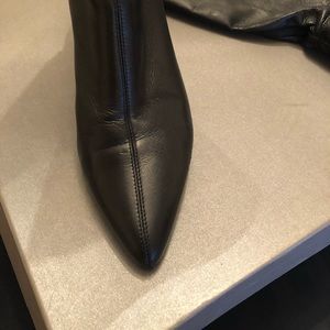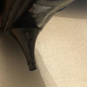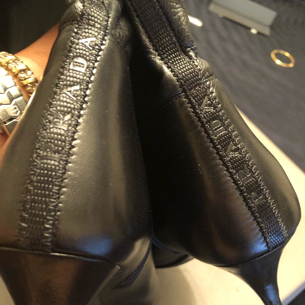 PRADA. Soft stretchy 💯 Leather 💯 AUTHENTIC. 2.5 Heels. These boots maybe worn 5 times. They are like New. Just got banged around. A good shoe repair will fix these right up Classic PRADA rubber bottoms. full soles. Couple bruises. But great boot. Lots Of Life... original box.