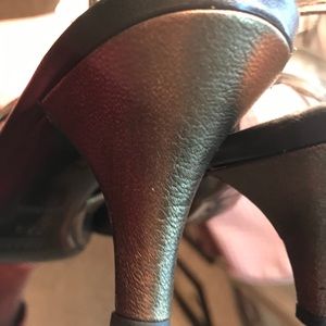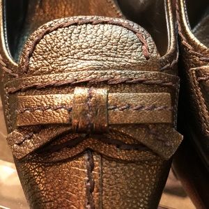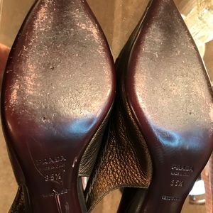 Beautiful, in new condition Prada metallic gold meals. They do have the adjustable strap in the back, these are super comfortable to walk in and like I said excellent condition! A must! Can fit a six or 6 1/2. These are straight up classy. Fabulousness! Offers always welcome at the other offer button only please. Thank you!